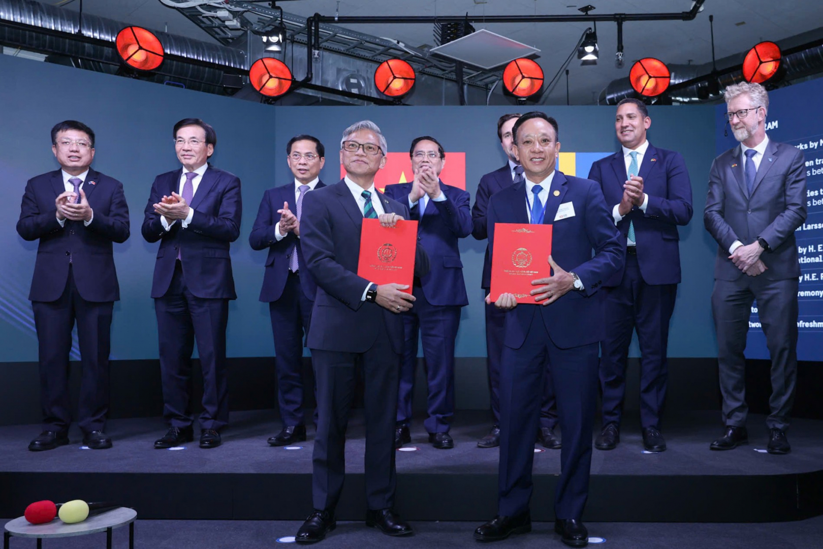 Trường Đại học Hàng hải Việt Nam và Đại học Hàng hải Thế giới trao văn kiện hợp tác dưới sự chứng kiến của Thủ tướng Phạm Minh Chính và Bộ trưởng Bộ Hợp tác quốc tế và Ngoại thương Thụy Điển (ngày 12/6/2025)