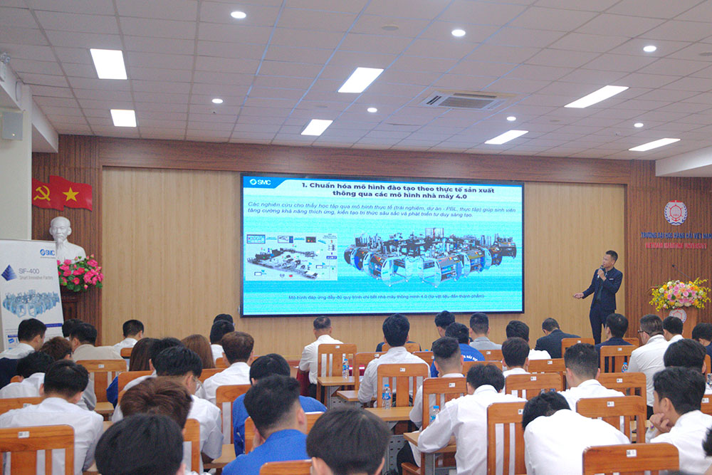Trong khuôn khổ Hội thảo, các nội dung chuyên môn được trình bày đa dạng, thể hiện góc nhìn của doanh nghiệp và cơ sở đào tạo. Phía Nhà trường, các đơn vị chuyên môn đã trình bày thực trạng đào tạo kỹ thuật điều khiển thủy khí, định hướng phát triển ngành Cơ điện tử, cũng như chia sẻ về hệ thống cơ sở vật chất và các phòng thực hành, thí nghiệm phục vụ đào tạo các ngành kỹ thuật. Đại diện Công ty TNHH SMC Corporation Việt Nam cũng đã giới thiệu tổng quan về doanh nghiệp, đồng thời phân tích xu hướng tự động hóa cùng những thách thức trong bối cảnh công nghiệp hiện đại. Đặc biệt, Hội thảo đã giới thiệu nhiều mô hình và giải pháp công nghệ tiêu biểu như mô hình lắp ráp tự động MAP-205 I4.0, mô hình nhà máy thông minh SIF-400,... Những giải pháp này không chỉ minh họa xu hướng sản xuất hiện đại, mà còn mở ra hướng tiếp cận thực tiễn trong đào tạo, giúp sinh viên có cơ hội tiếp cận công nghệ ngay trên giảng đường.