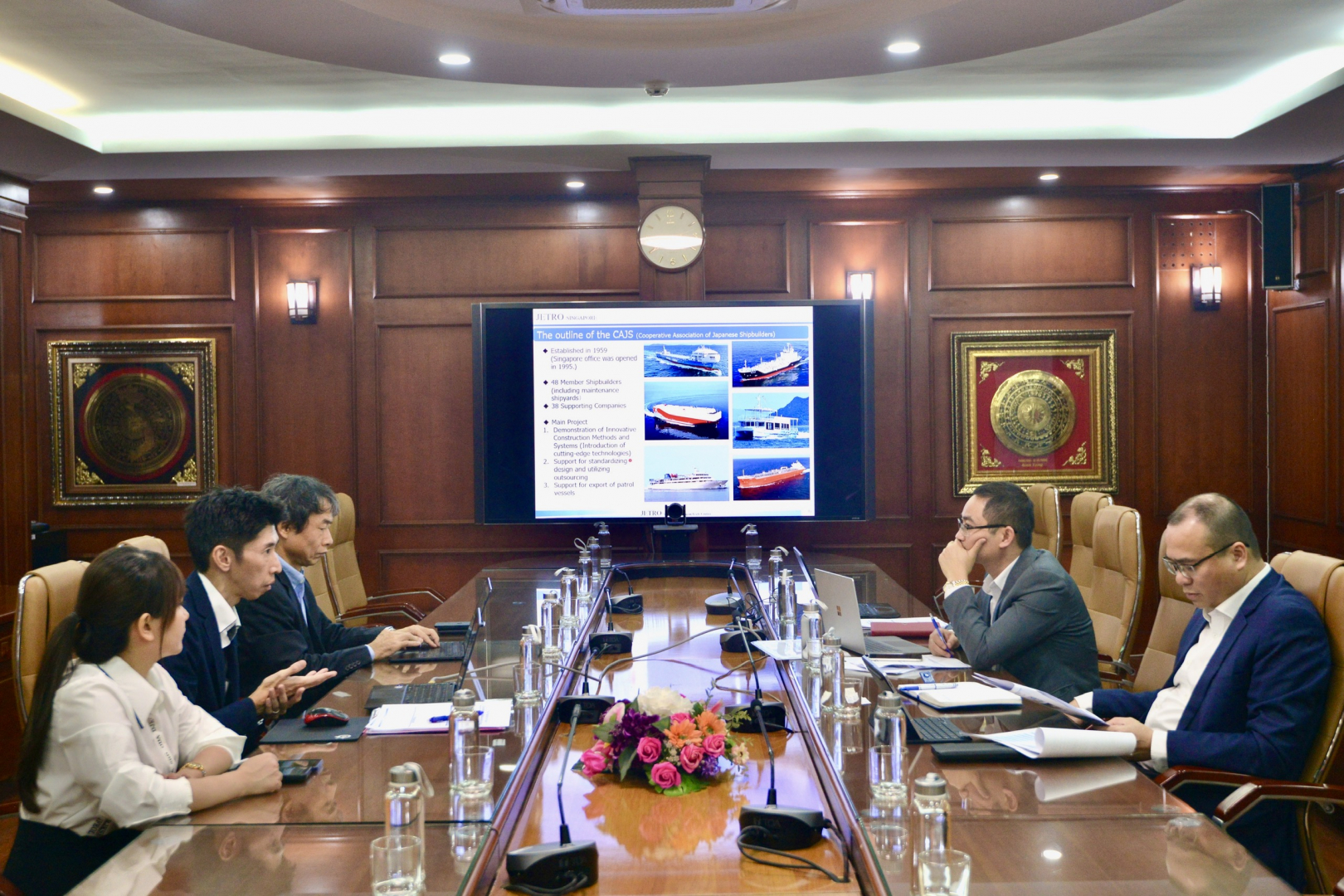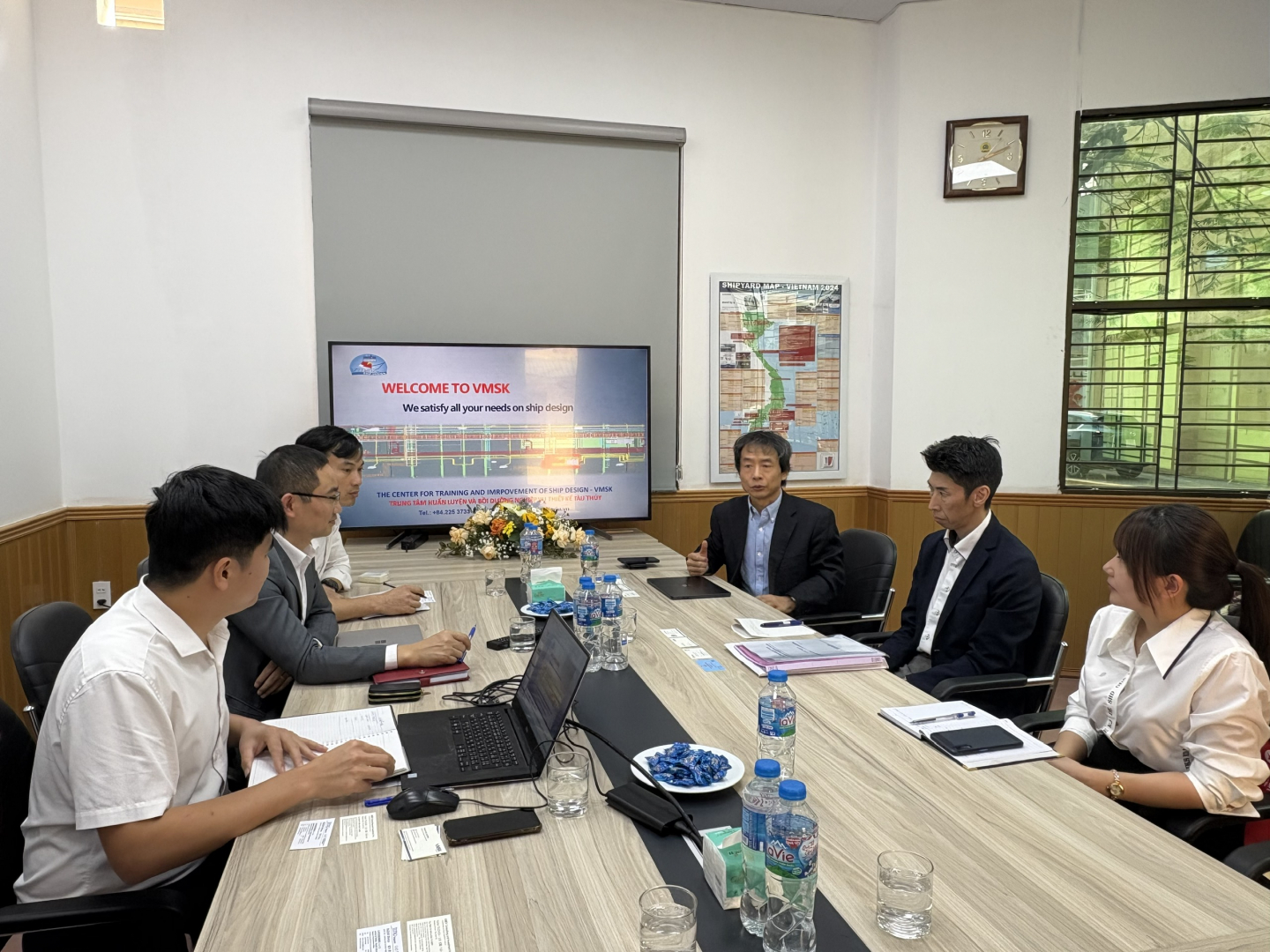 Buổi làm việc do PGS.TS. Nguyễn Minh Đức - Phó Hiệu trưởng Trường Đại học Hàng hải Việt Nam chủ trì cùng sự tham dự của lãnh đạo Khoa Đóng tàu, Công ty TNHH Trung tâm Huấn luyện và Bồi dưỡng nghiệp vụ thiết kế tàu thuỷ (VMSK), đại diện Phòng Quan hệ Quốc tế. Đoàn công tác Nhật Bản có ông SUZUKI Shinya - Giám đốc JETRO Singapore, ông TSUCHIDA Yoshiki - Tổng Giám đốc Công ty TNHH Tư vấn và Đầu tư AMEV cùng các cán bộ liên quan.