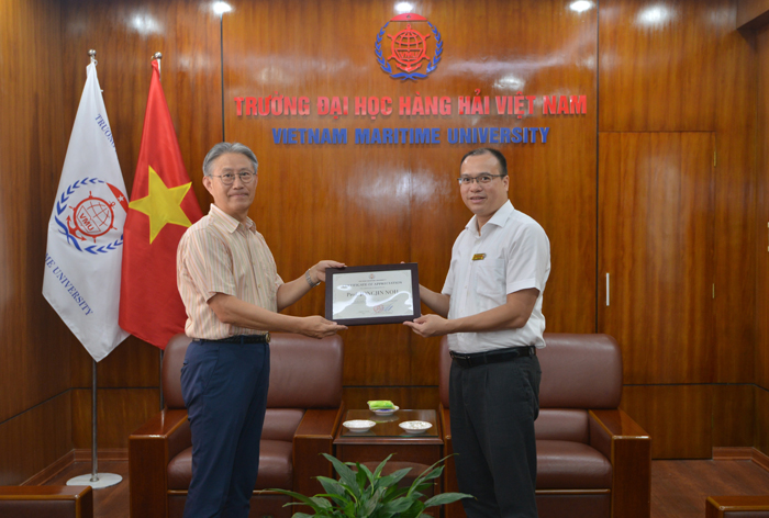 PGS.TS. Nguyễn Minh Đức - Phó Hiệu trưởng Nhà trường trao giấy chứng nhận của Trường Đại học Hàng hải Việt Nam cho GS. Jongjin Noh